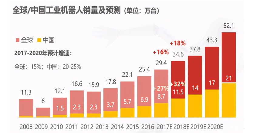 物流机器人,逐渐被认为是物流及供应链相关企业数字化与自动化进程中重要的智能基础设施,预计未来三年仍将保持15%以上的增长速度,至2020年将全球超过50万台。在全球15大工业机器人销售市场,中国居首,预计2020年将超过20万台,占全球市场份额达40%。