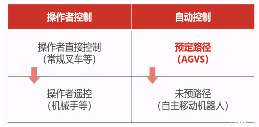 仓储机器人基于控制方式及程度,可分为四大类:操作者直接控制、操作者遥控、预定路径、未预路径。从作业模式上,仓储机器人可分为:引导式机器人、跟随机器人(follow me)、自主运行机器人。