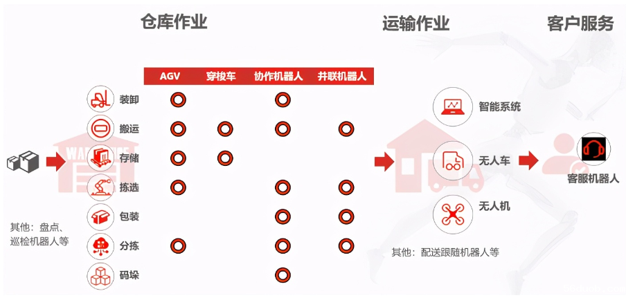 机器人在内陆物流的主要应用以AGV、穿梭车、协作机器人、并联机器人为主,在不同的作业场景下,有不同的产品与解决方案。
