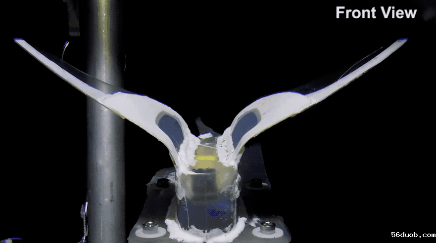图|在 10900 米深的马里亚纳海沟中,软体机器人的双鳍拍打动作(来源:Nature)